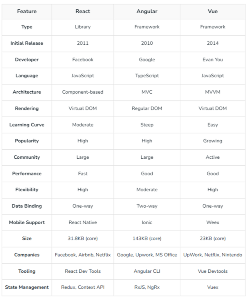 React VS Angular VS Vue: Difference Table