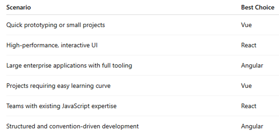 For long-term projects with large teams, Angular’s conventions can be beneficial, while React and Vue offer flexibility that supports iterative growth.