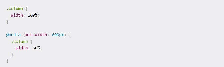 - This media query defines rules that apply to viewports with a minimum width of 600 pixels (viewports wider than 600 pixels). The column element will be 50% wider than its parent for viewports wider than 600px.